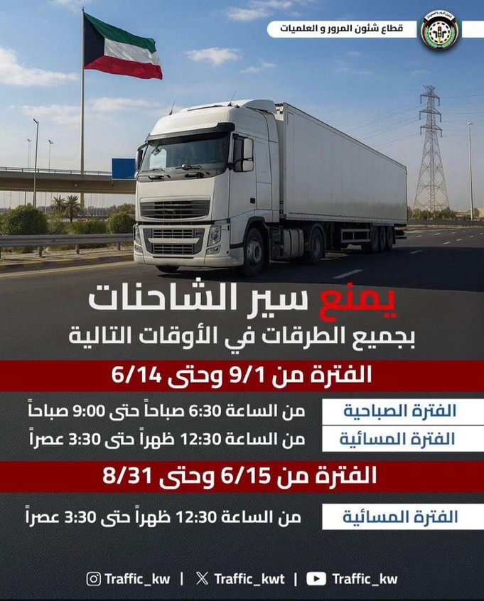 في إطار حرص وزارة الداخلية على تنظيم الحركة المرورية والحد من الازدحام خلال الفترات التي تشهد كثافة مرورية في حركة المركبات، أعلنت الإدارة العامة للمرور عن تحديد أوقات منع سير الشاحنات على الطرق الرئيسية اعتباراً من 2025/9/1 حتى 2026/6/14، وذلك على النحو التالي: