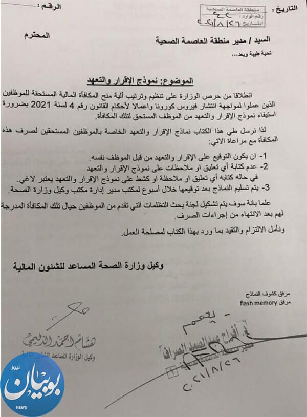 وأوضح الكتاب الذي حصلت “الانباء” على نسخة منه انه يجب على الموظف التوقيع بنفسه على اقرار التعهد الخاص بالمكافأة ومن يتضمنه من ايام عمل خلال الفترة من 24فبراير وحتى 31مايو 2020 مشيرا الى انه يمنع كتابة أي تعليق على اقرار التعهد وفي حال مخالفة ذلك يعتبر التعهد ملغى.