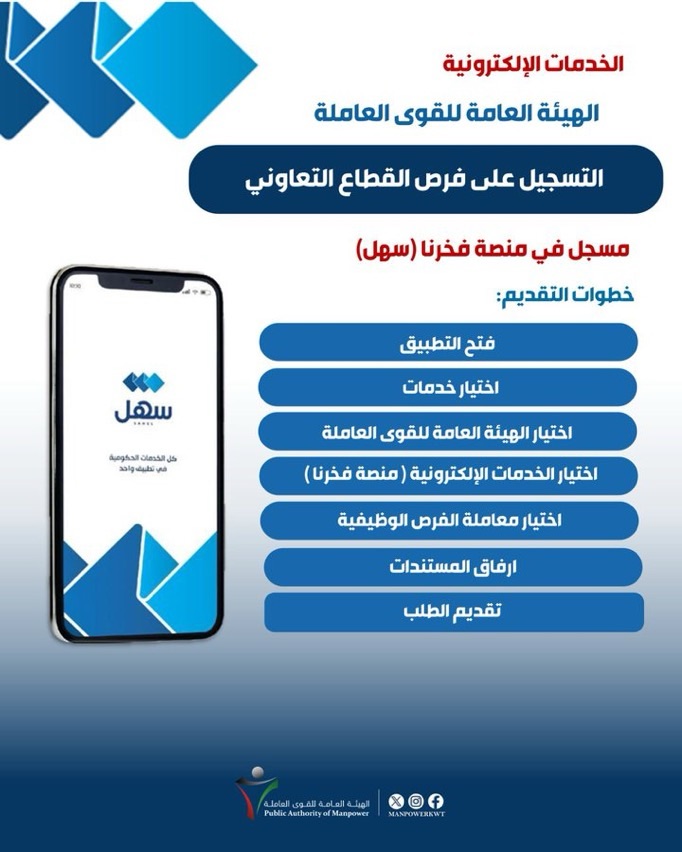 أعلنت الهيئة العامة للقوى العاملة عن بدء استقبال طلبات التسجيل لفرص العمل في القطاع التعاوني، وذلك من خلال منصة “فخرنا” على تطبيق “سهل” الإلكتروني، ضمن جهودها لتسهيل وصول المواطنين إلى الفرص الوظيفية.