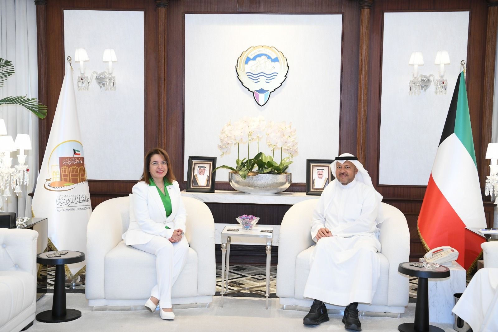 استقبل معالي محافظ الفروانية الشيخ عذبي ناصر العذبي الصباح في ديوان عام محافظة الفروانية صباح اليوم الدكتورة أميرة الحسن رئيس بعثة الأمم المتحدة للمستوطنات البشرية (موئل) في الكويت ودول الخليج العربي لبحث التعاون المشترك