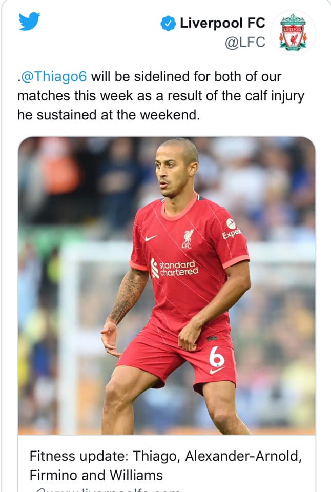 وبذلك أصبح تياغو ثاني لاعب وسط في ليفربول يتعرض للإصابة مؤخرا، عقب تعرض هارفي إيليوت إلى كسر في الكاحل خلال مواجهة ليدز يونايتد الأسبوع الماضي وخضوعه لعملية جراحية بعد ذلك.