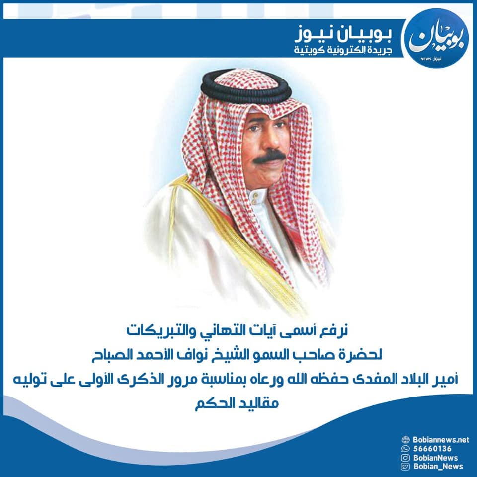 نرفع أسمى آيات التهاني والتبريكات لحضرة صاحب السمو الشيخ نواف الأحمد الصباح أمير البلاد المفدى حفظه الله ورعاه بمناسبة مرور الذكرى الأولى على توليه مقاليد الحكم