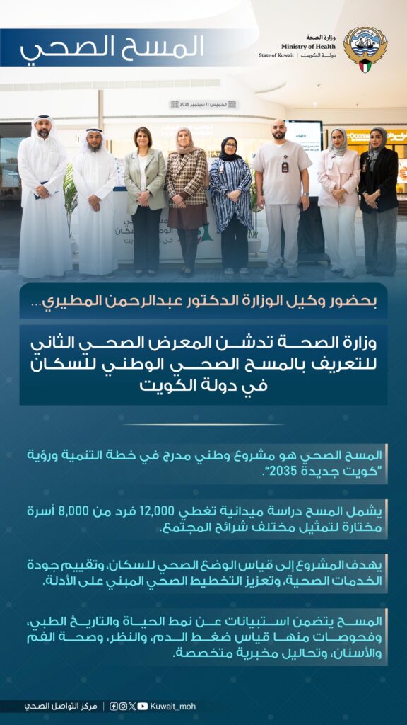 في إطار جهودها لتعزيز الصحة العامة وتطوير قاعدة البيانات الوطنية، دشنت وزارة الصحة المعرض الصحي الثاني ضمن الحملة التعريفية بالمسح الصحي الوطني للسكان في دولة الكويت، وذلك في مول العاصمة، بحضور وكيل الوزارة الدكتور عبدالرحمن المطيري، وبوصفه أحد المشاريع الوطنية المدرجة في خطة التنمية ورؤية “كويت جديدة 2035”.