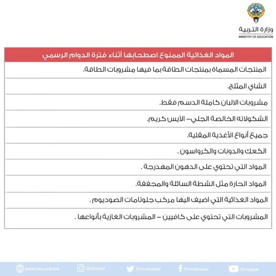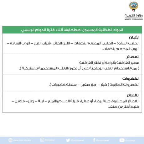 تربية وتعليم وزارة_التربية : وقف جميع أنشطة “المقاصف المدرسية” كتبه Radwa 2021-09-12 2021-09-12 58 وزارة_التربية : وقف جميع أنشطة “المقاصف المدرسية” و السماح بتزويد أولياء الأمور أبنائهم بما يحتاجونه وفق قائمة الأصناف المسموحة و تجنب المواد الغذائية الممنوعة .. حسب الجداول المرفقة قد يعجبك أيضاً وزير_التربية: التعليم الخاص في المدارس العربية تبدأ بنفس التواريخ الحكومية اعتماد التقويم التربوي الشامل لخمسة أعوام دراسية مقبلة لـ #التربية «الجامعات الخاصة»: فتح باب التقديم لضم وإعادة ضم البعثة بجامعتي الشرق الأوسط الأميركية والخليج للعلوم والتكنولوجيا التربية: فتح باب النقل الاستثنائي للمعلمين والإداريين في المدارس الجديدة بمنطقتي المطلاع وإشبيلية فقط شارك FacebookTwitterWhatsappTelegramCopy Link قد تعجبك أيضاً معلمو ومعلمات اللغة العربية في المرحلة الابتدائية: تدريس 4 ساعات... 2021-09-20 التربية: انطلاق دوام الصف الأول الابتدائي للعام الدراسي الجديد.. اليوم 2025-09-15 وزير التربية يصدر قرارات تنظيمية لتعزيز كفاءة العمل في الوزارة 2025-08-28 وزير التربية يهنئ المعلمين بالعام الدراسي الجديد 2021-09-18 مرسوم أميري بتعيين الدكتور بدر حسن عبدالرحمن البصيري وكيلا لوزارة... 2025-08-26 نظام العمل في المدارس الخاصة للعام الدراسي الجديد 2021-09-07 التربية تطبق التقييم التحصيلي في المدارس المتوسطة والثانوية 2021-09-12 عاجل | وزير المضف : العودة للمدارس في 3 أكتوبر... 2021-08-11 جامعة الكويت: بدء «تسجيل المقررات الثانية» الخميس المقبل 2025-08-23 إيقاف التعيينات الجديدة لمادة التربية الفنية بالمرحلة الثانوية 2021-09-22