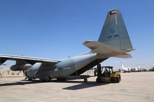 وتأتي هذه الطائرة ضمن الحملة الانسانية (الكويت بجانبكم) وبتنظيم من جمعية الهلال الأحمر الكويتي بالتعاون مع وزارات الخارجية والدفاع والشؤون.